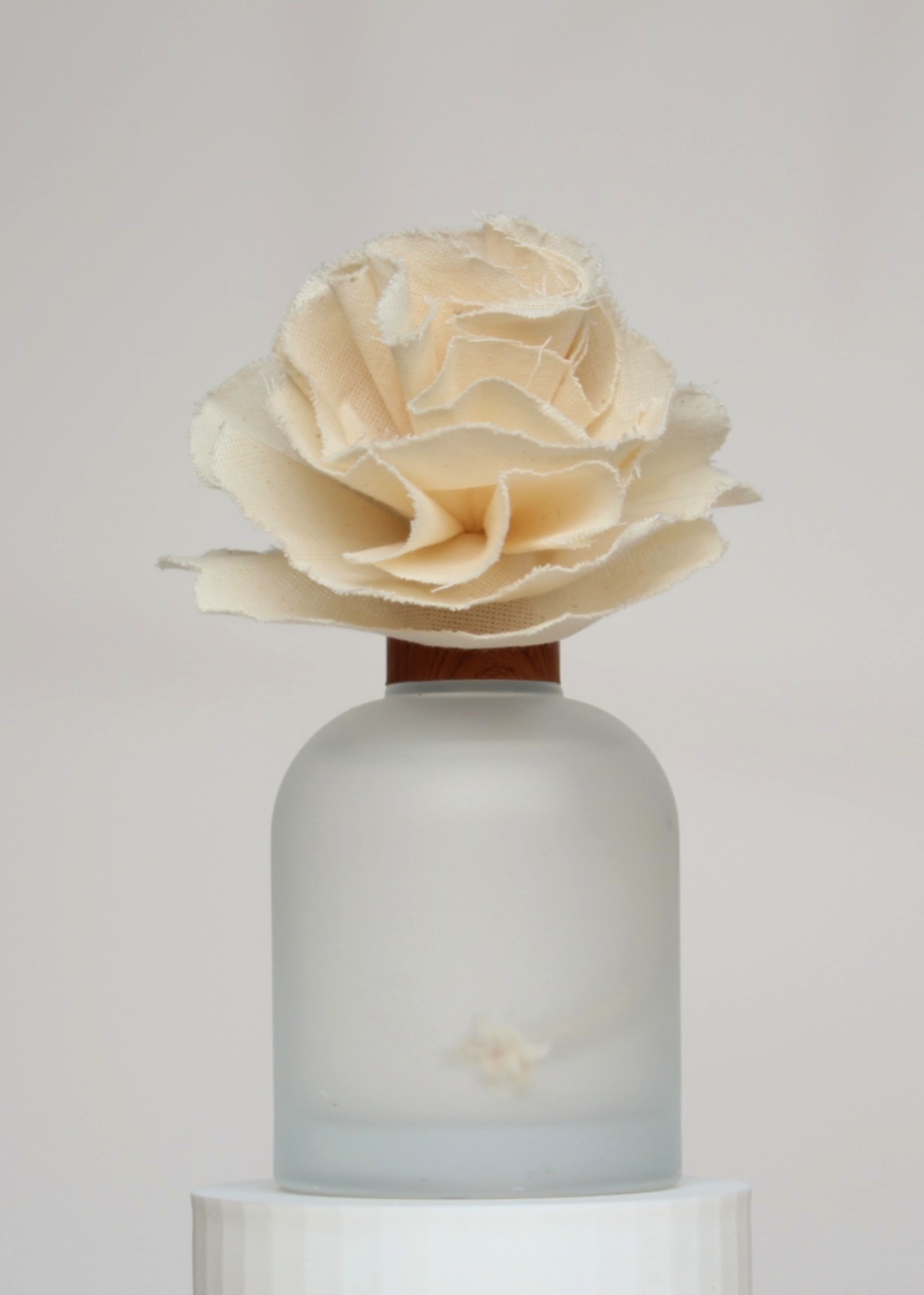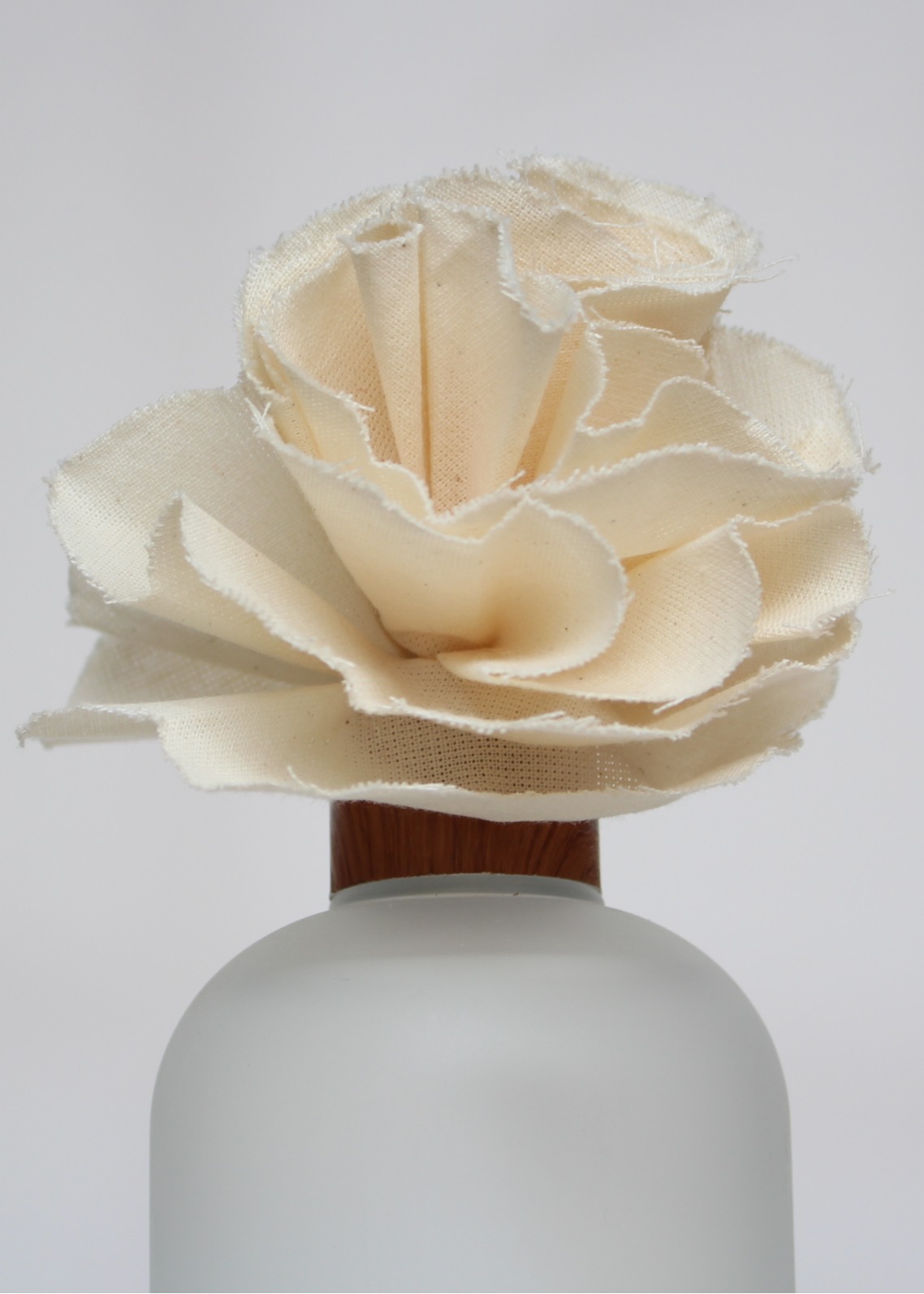 Frasco de vidro transparente fosco com flor de algodão e varetas 25cm, tampa cobre